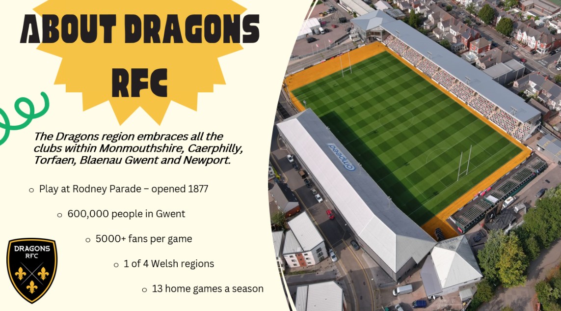 Dragons Rugby Football Club is a professional Welsh rugby union team based at Rodney Parade in Newport, South Wales, representing the Gwent region. In 2024 they were crowned Team Modeshift National Travel Award Winner in the Sustainable Spectator Travel Event of the Year category.