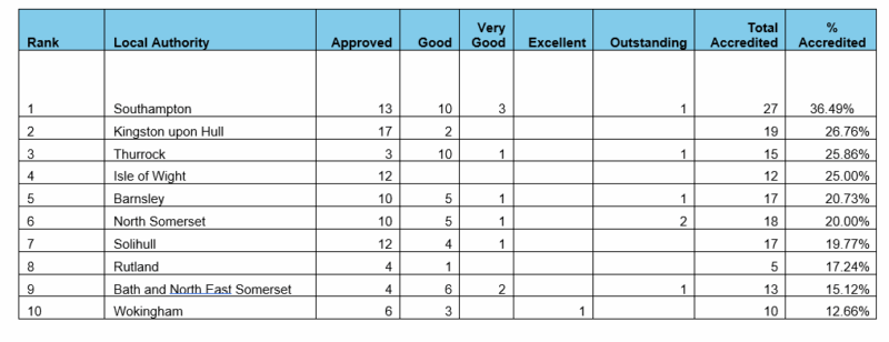 - Buckinghamshire has become number one in the large LA category, with an impressive 30.83% of schools accredited, up three places since Spring.